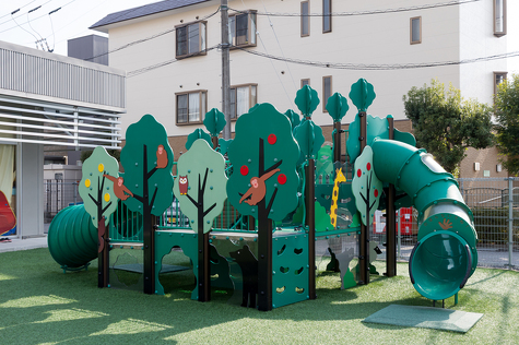 固定遊具は「森に隠れる動物を探す」世界観でデザイン。子どもが物語をつくり、想像をふくらませながら遊べます。